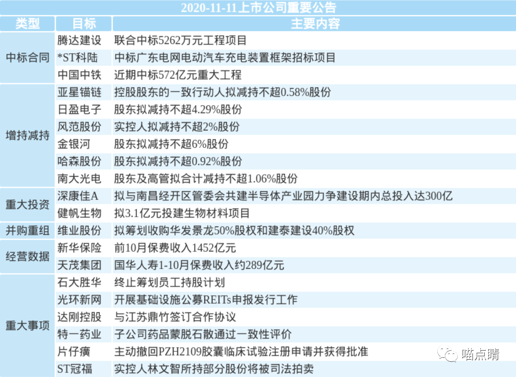 4、MSCI日前宣布了半年度指数评审结果,此次虽不涉及A股纳入因子变化,但对于A股股票仍有调调整。MSCI中国A股在岸指数增加成份股58只,剔除23只标的,新增前几大标的包括金龙鱼、长城汽车、澜起科技、中微公司、石头科技、康希诺等。调整结果将于11月30日收盘后生效,届时涉及标的或有小幅度异动。