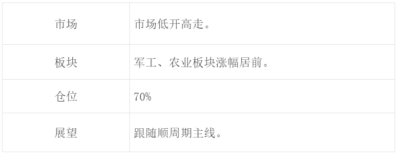 结构方面短期还是关注低估值顺周期方向,金融、有色、化工、家电、军工这几个板块是典型,交易层面上继续保持“跟随主线,高抛低吸”的思路就好。