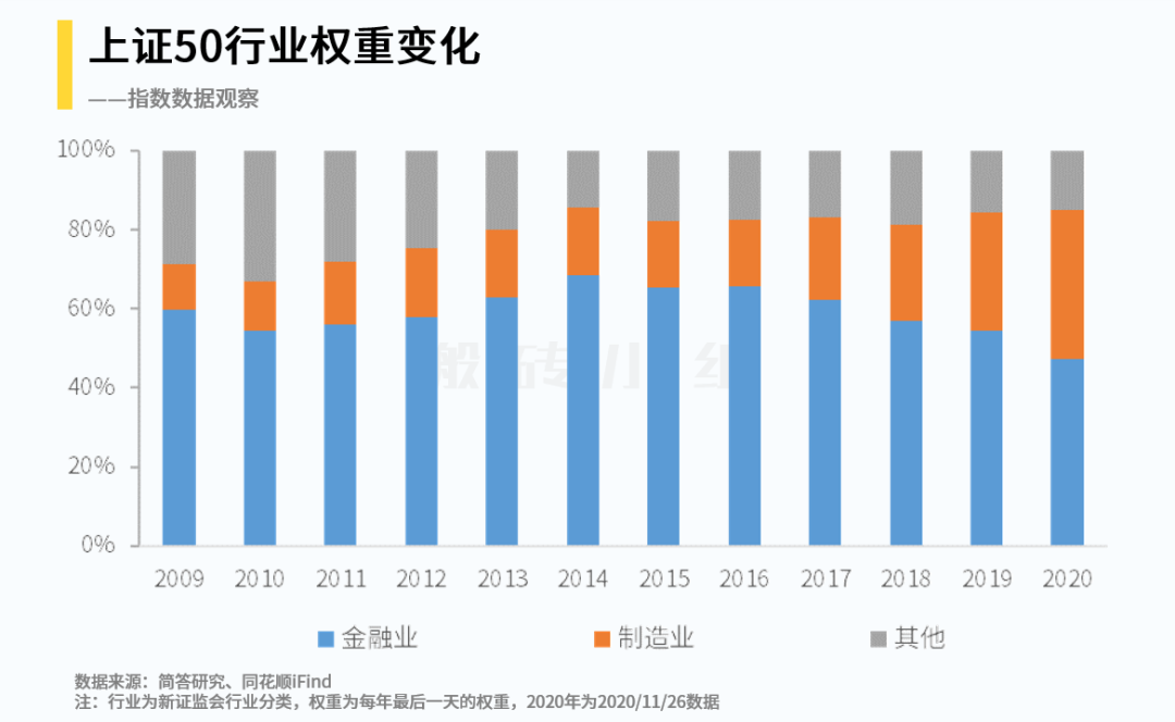 但是这其中有一个不可忽视的变化,就是上证50的成份股是有变动的,金融股的权重持续在下降,对于指数的推力其实是减弱的,制造业公司对于上证50指数的推动比金融猛,但是金融股的市场关注度比较高,尤其是四大行这样的巨无霸,一根大阳线,大家都觉得不得了。