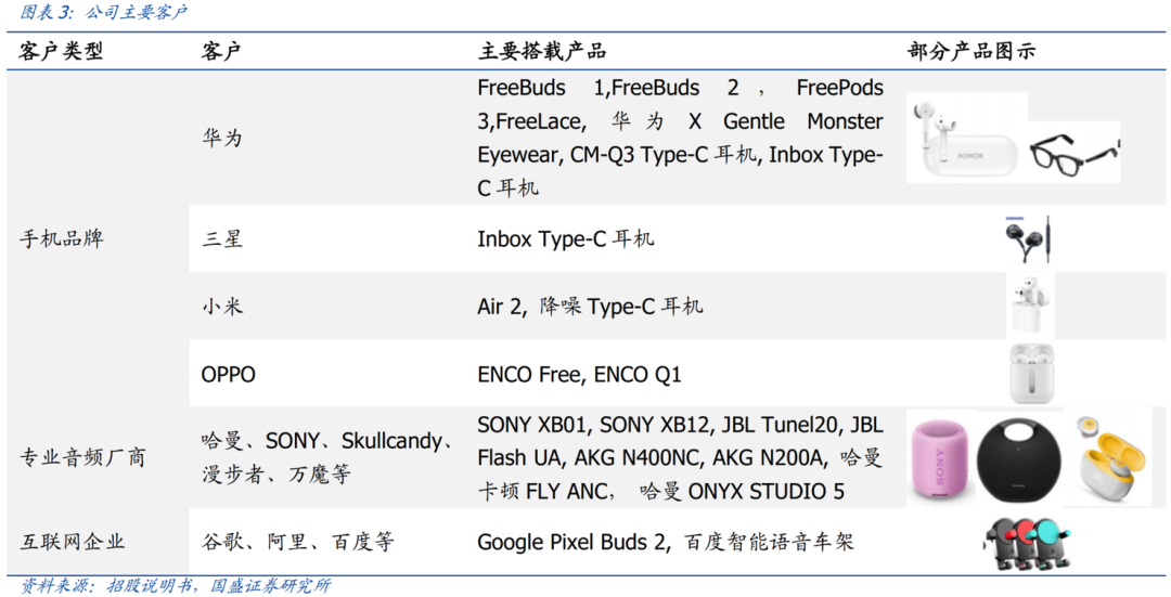 2)公司的客户明星云集。产品终端厂商包括了华为、三星、OPPO、小米等手机品牌和哈曼、SONY、Skullcandy 、漫步者、万魔等专业音频厂商,还有谷歌、阿里、 百度等互联网公司。当然公司主要的销售模式是经销,并不是自己直接卖给了这些厂商。
