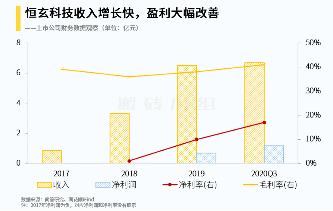 在业务上,恒玄科技搭上了近年无线耳机爆火的浪潮,收入增长很快,从2017年的0.85亿元上升到了2019年的6.49亿元,涨幅664%;净利润也由负转正,今年前三季度达到了1.17亿元,净利率大幅改善,毛利率保持了相对的稳定。