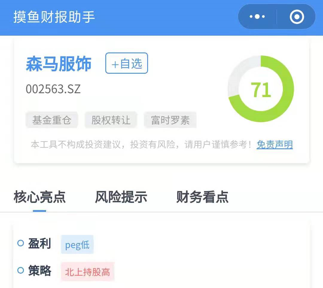 摸鱼评分76分。公司核心亮点包括peg低、北上持股高、机构买入评级等。需要注意的点有收入三连降、扣非利润三连降等。