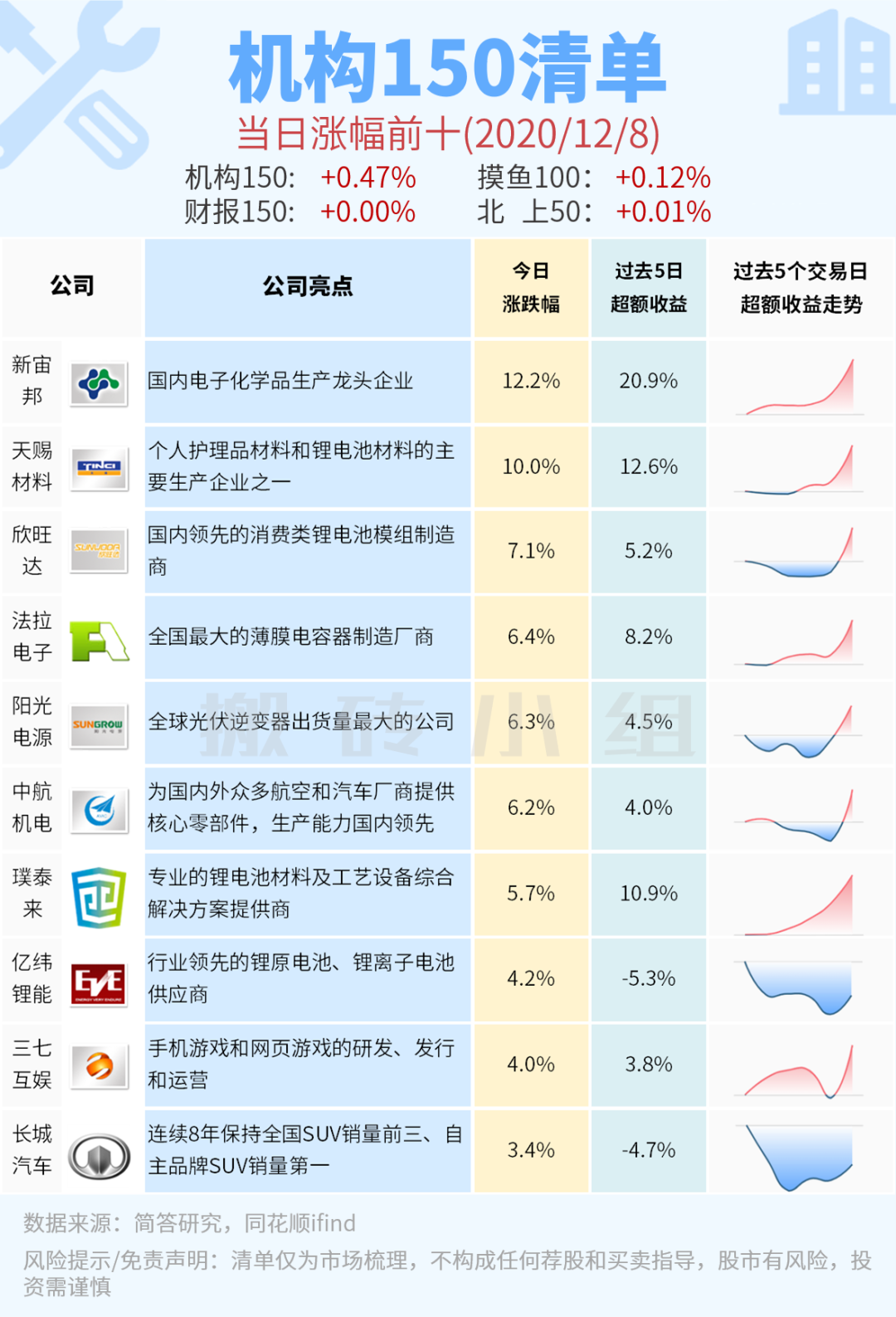 【机构150】涨幅前十观察: