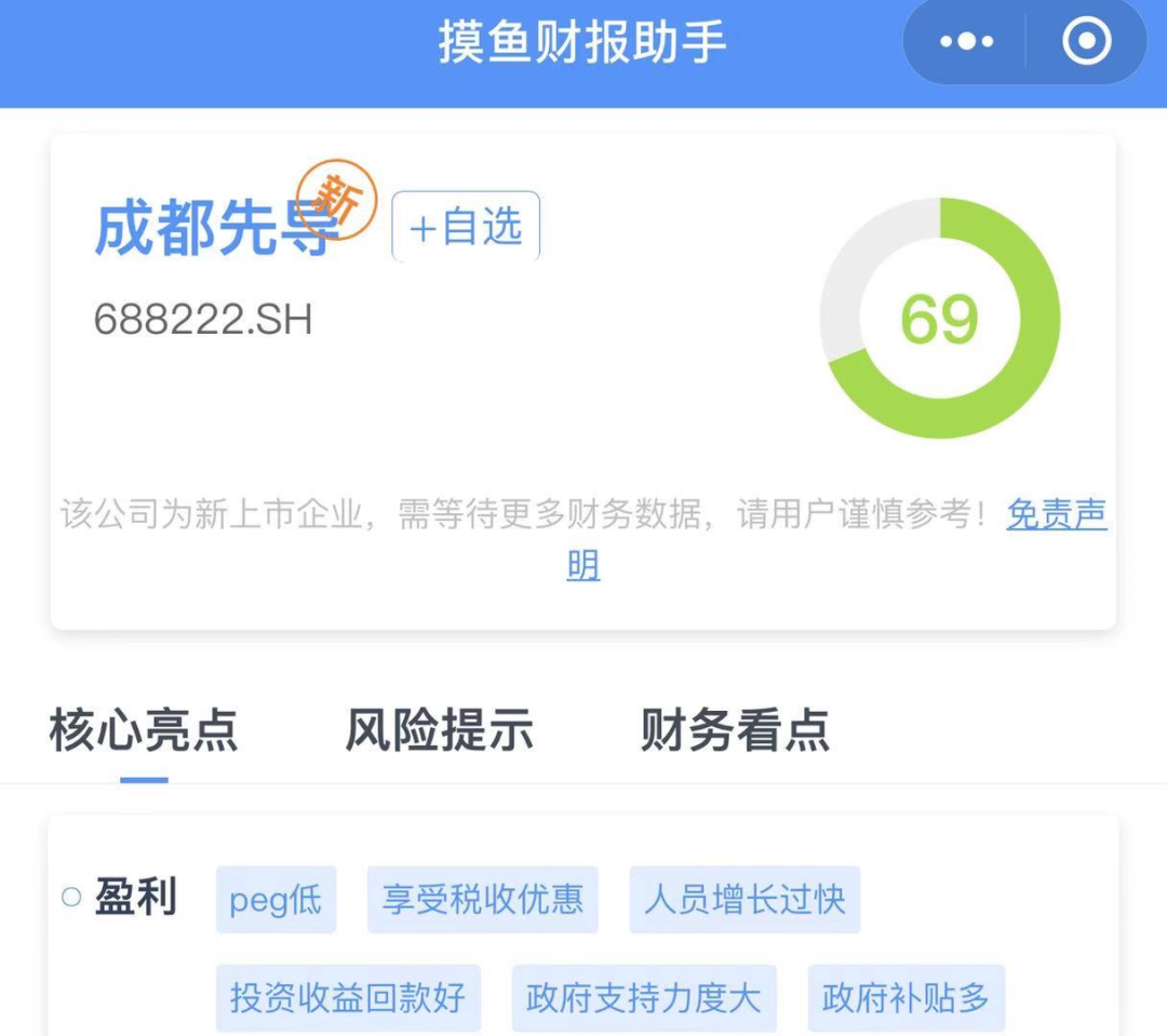 摸鱼评分69分。公司核心亮点包括投资收益回款好、PEG低、享受税收优惠等,需要注意的点主要有扣非利润三连降、解禁将近等。