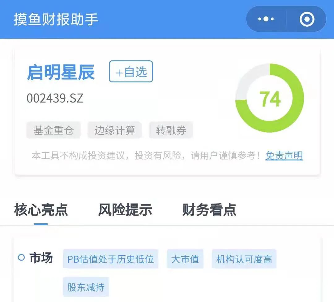 公司评分74分。公司核心亮点包括机构认可度高、PB估值处于低位、PEG低等,需要注意的点有QFII减仓、商誉减值等。