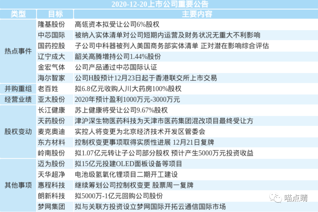 1、隆基股份股东拟向高瓴资本转让6%的公司股份,转让价格为70元,折价9.85%,交易总额158亿元。周末的经济会议其中的一项重要任务便是做好碳达峰、碳中和工作,高瓴此时大手笔入局“碳中和第一股”,真是够应景。