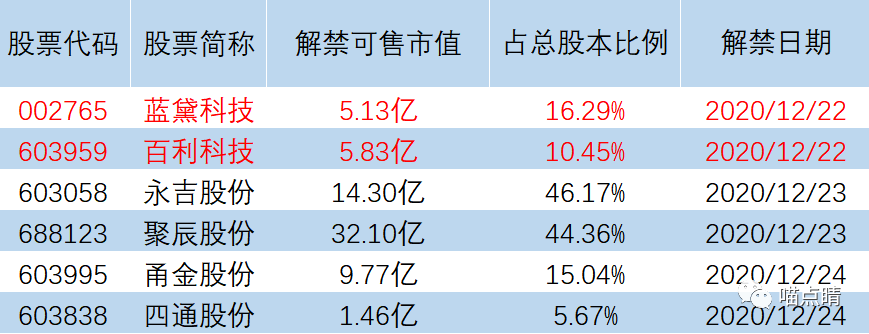 蓝黛科技、百利科技今日有大额可售市值解禁。