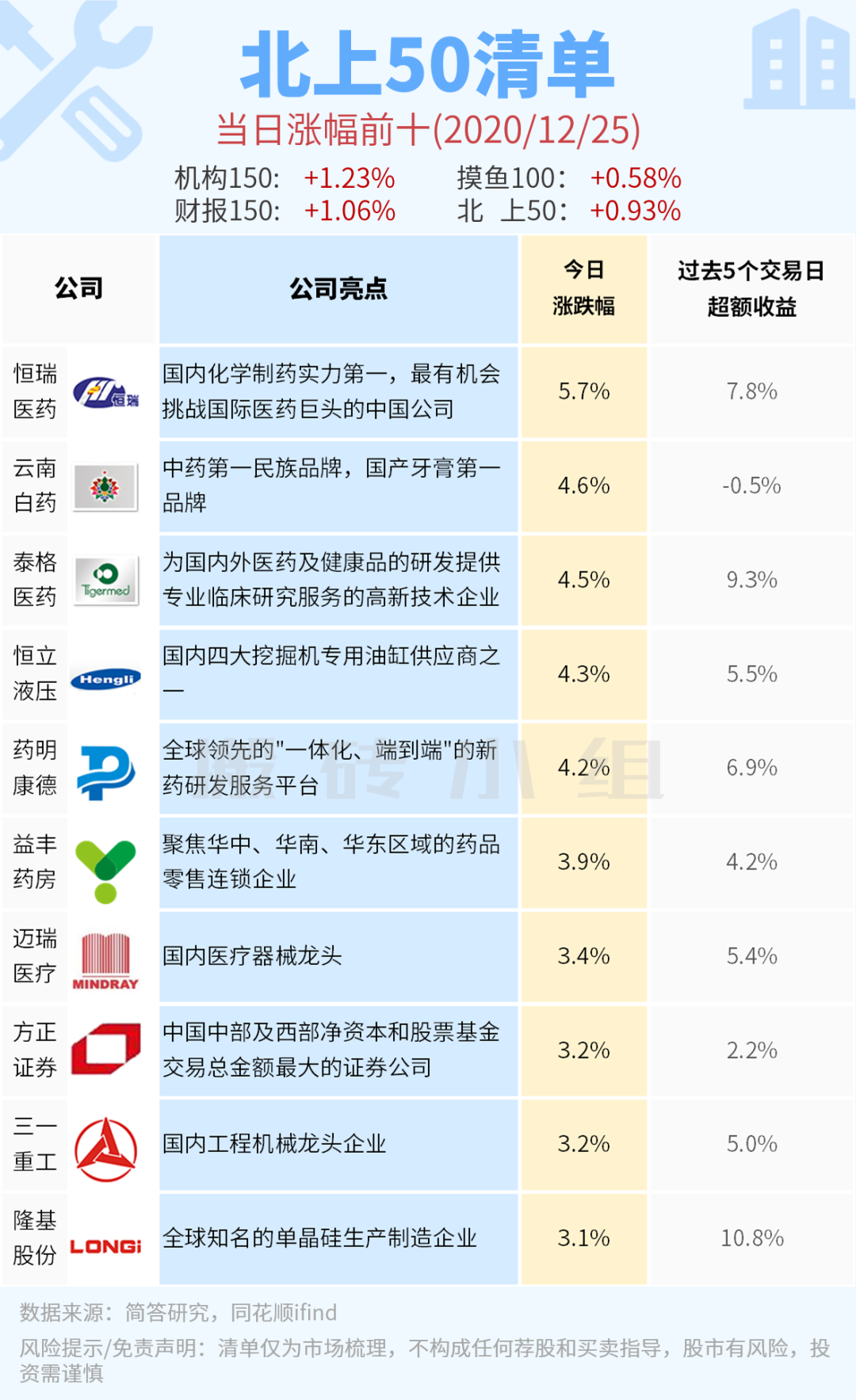 多头情绪来了! 2020年12月25日 / 今天市场比较好,上午震荡一小时以后就开始绝地反击,后3小时多头完全控场,今天这个走法舒服~ 盘面上,上午一个小时我就发现市场极致缩量,日内已经有跌不动的感觉了,随后有股神秘力量来拉券商,最后收盘涨停接近100家,这个情绪是很久没有见过,感觉多头开始出动了。 结构上今天煤飞色舞,大宗的行情演绎得非常极致,这块底层逻辑还是流动性驱动,之前这块聊过,逻辑戳右边就行。(👉:聊个明年的机会) 煤炭继续暴涨,龙头郑州煤电继续涨停,这个已经是当前市场的情绪龙头了,可以看着他观察市场的情绪。煤炭当前的逻辑就是涨价、冷冬和价格博弈,时间点就是元旦附近了,参与的注意一下时间。 有色这块是今天盘面热度最高的板块,有意思的是有色指数今天已经创新高了,这是非常重要的一个信号,资金明显正在跑步入场。 有色这块主要分成三个细分,贵金属、顺周期和新能源车逻辑都不太一样,共同的都是流动性驱动,但是需求这边会有区别,贵金属这块意思不大,主要聊聊顺周期和新能源车用的这两块。 顺周期主要看铜和铝,需求需要全球疫情恢复的拉动,这个要看疫情数据、疫苗和欧美的刺激计划的变化,最近这个逻辑还有些扰动,但可能是中期比较高的布局时间。 新能源车这块就是锂钴镍稀土,新能源产业链公司很多,但是上游是新能源车无论如何都绕不过去的,核心的都已经在A股公司手里了,确定性非常高,市场也非常愿意给估值,最近已经在走加速趋势了,在车上的蹲着就好。 —————— 昨天晚上我做了一下复盘,看了一圈现在市场结构已经是结构性牛市和结构性熊市了,分化特别严重,但是指数就是横着不怎么动,做市场的总量判断已经不太容易挣钱了,更多的是要去做行业的研究。 背景我感觉还是因为注册制和市场机构化,现在已经有4000家公司,但是往后会继续增加,分化一定会加剧,而且增量资金都在机构手上,龙头牛市中期逻辑是非常明确的。 这种情况下,策略上要降低对总量的判断,增加行业和个股的思路,也是为啥我每天都会聊板块上涨逻辑的原因。往后想赚到市场的钱机会会很少,以后要更加专注行业的beta和个股的alpha才行。 ————— 【北上资金观察】北上暂停。 【北上50涨幅前10】 北上继续暂停,今天比较明显的是内资已经卖不太动了,下周看北上是否支持这个看法了。 北上50榜单上医药涨幅居前,这个行业真的太牛了,消费医药这种长赛道会有一堆粉丝一直买,回头看每跌20%都是介入的机会。。 ————— 市场当前继续是结构性行情,今天这个小普涨还是很舒服的,但下周就是今年最后一周了,说不准会有些大波动,短期注意一些就好。 中期看1月就开始年报预告了,元旦后市场会围绕着业绩做文章,Q4业绩确定的方向可以逢低布局些,到时候净利润断层模式也可以用起来。 最后,大家圣诞快乐~ 数据跟踪 【ETF】 【数据跟踪】 涨停97家,跌停17家,情绪很好。 涨多跌少,涨幅中位数0.68%。 如果有不了解【北上50】的小伙伴,可以在公众号菜单栏回复关键词【北上50】,就能获取北上50的清单啦~公众号菜单栏还有很多精彩内容等待大家探索哦~ 原创不易,喜欢请星标+在看+点赞,常读公众号,不错过市场机会,谢谢鼓励! 上一篇 下一篇