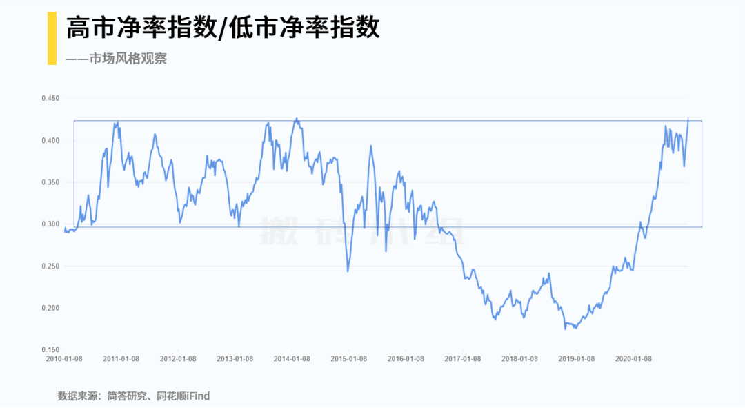 市场的风格跟踪我常用的是PB风格指数的比值,到上周五这个数值已经创下了10年以来的新高,“贵的越贵”就是现在的市场现状。