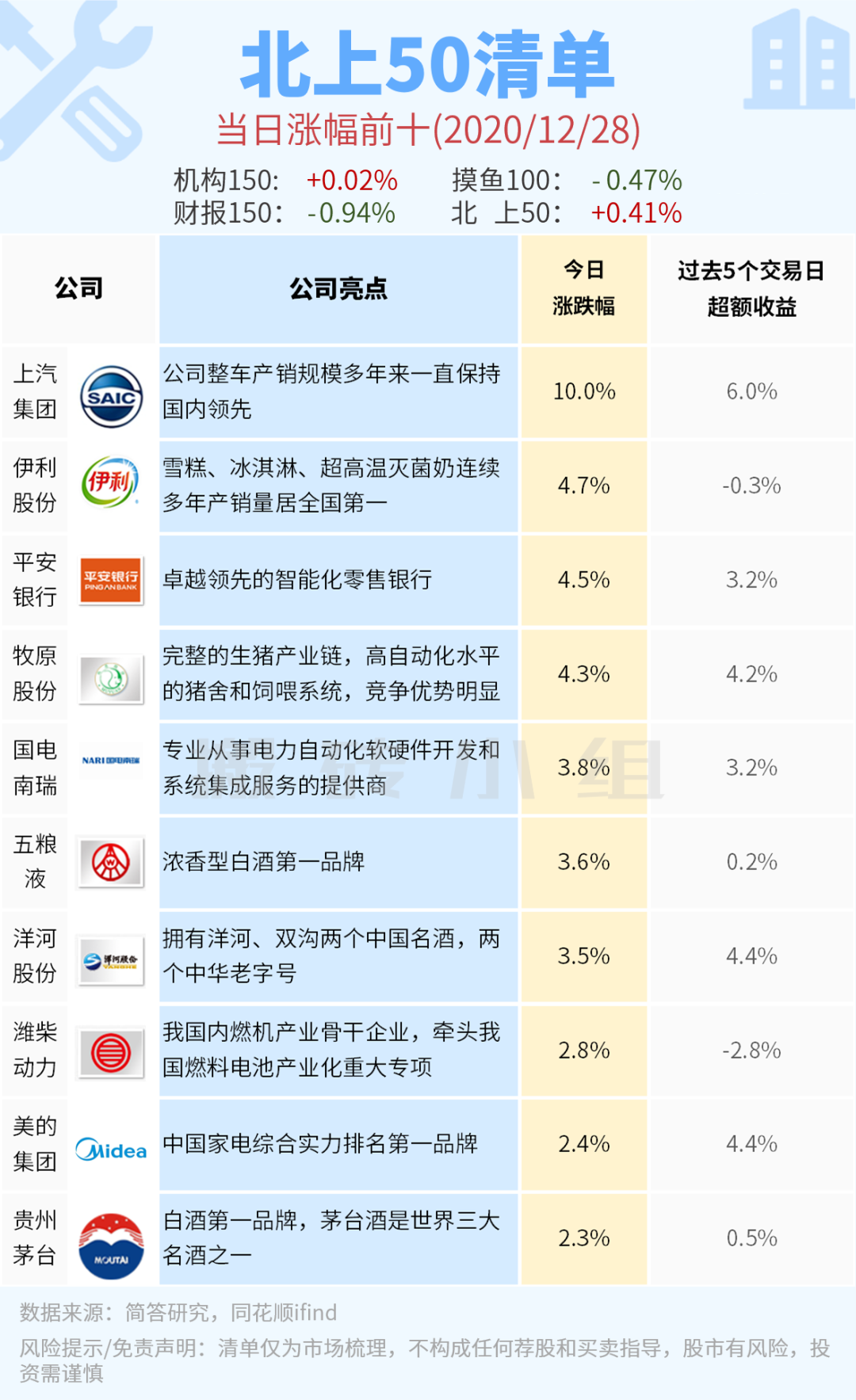 北上50榜单上涨幅第一的是上汽,有个上汽和阿里组建智己汽车的消息。最近只要跟智能汽车有关系的市场都给很高的溢价,但我个人感觉后排的还是少碰点好,涨到后期了,能继续走下去的只有龙头。
