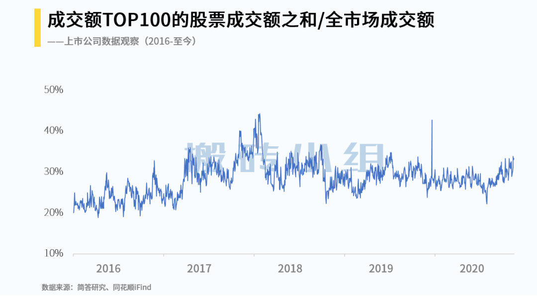 这里面有一个影响因素是市场扩容,现在市场在交易的股票有4120只,2018年初的时候大概是3200只,市场已经扩容了将近30%,这个比例可能被稀释了。把这个稀释的值硬补回去的话,头部100家的成交额就是33.3%*1.3,跟2018年初高点相比相对接近,但这个算法很粗糙,并不准确。