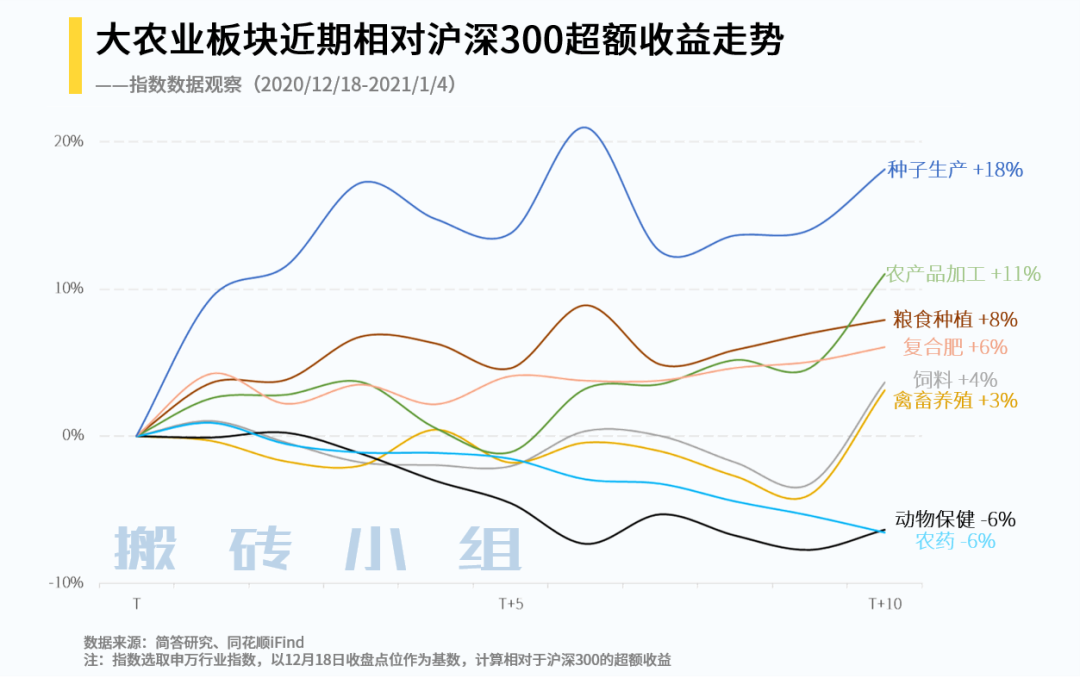 先看看农业里面几个细分板块在过去几天的超额收益情况,这里的比较基准是沪深300,可以发现分化很明显。