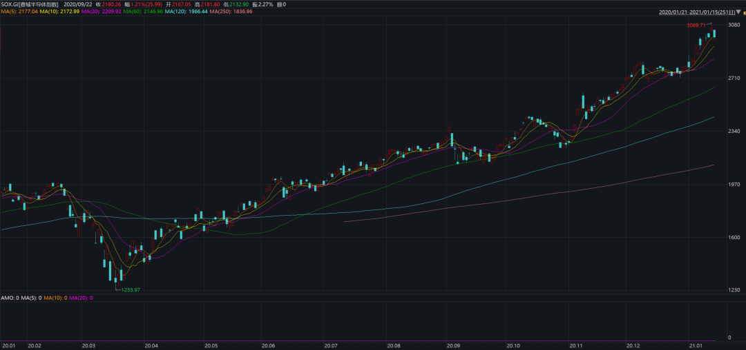其实看看国内半导体行业的整体走势,这半年与海外差别真的很大,代表全球半导体行业景气程度的费城半导体指数在去年一季度调整完后就开始一路上涨,这走势是真的牛。