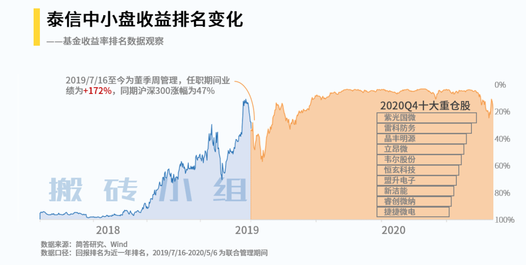 泰信中小盘的基金经理是董季周,基金规模不大,基金经理也很低调,要不是去年我们写这个产品,很多人可能完全没听过泰信这样的小公司。董在泰信是第一次管钱,能力都写在表现排名里: