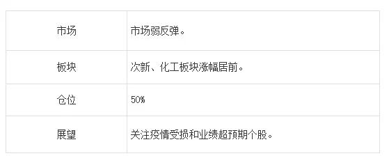结构上,继续跟踪疫情受损方向,同时关注底部走出来且业绩超预期的个股。