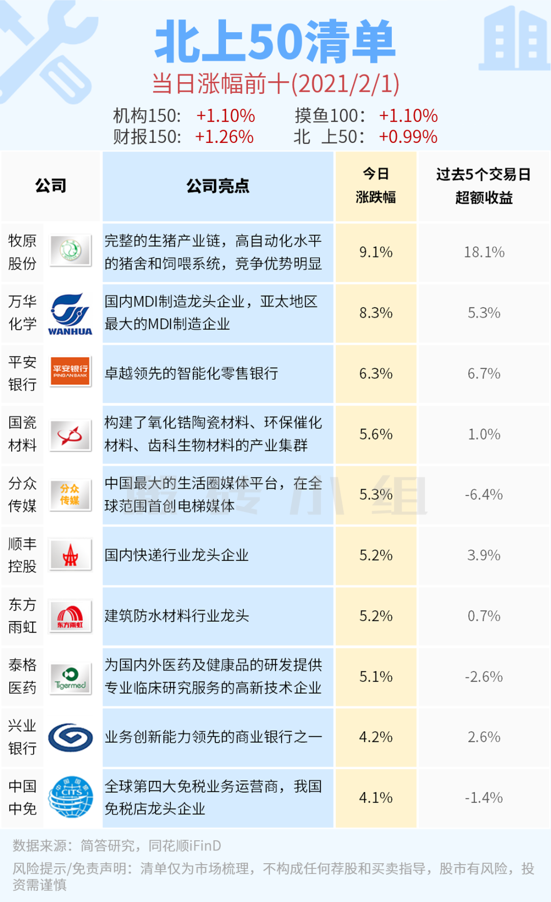 北上50榜单上今天涨幅第一的是牧原,但是上涨的原因跟牧原本身不是直接关系,周末正邦的暴雷,引发了市场对猪瘟的再次担忧,牧原的自繁自养模式是得到市场主流资金认可的,而且成本控制也非常好,年报预告出来以后确定性更强了。