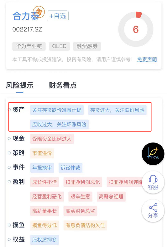 合力泰在我们的摸鱼财报助手中只有6分,是属于拉黑滚粗的类型。。而且风险标签中的第一行就写了三大条关于软资产减值的风险。市场总是雷声隆隆,一定要常备避雷神器,善用财报助手,关键时刻真可以保命的。。