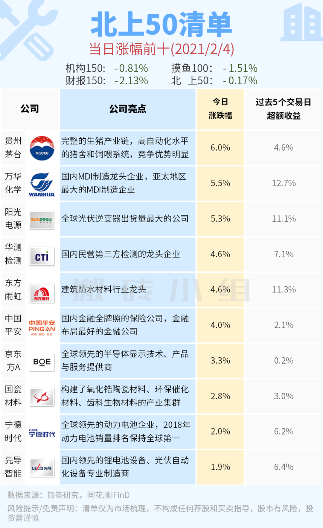 今天北上50榜单上的都是每个行业的大龙头,这几个票我感觉都是当前抱团的核心品种,真可以仔细看看。