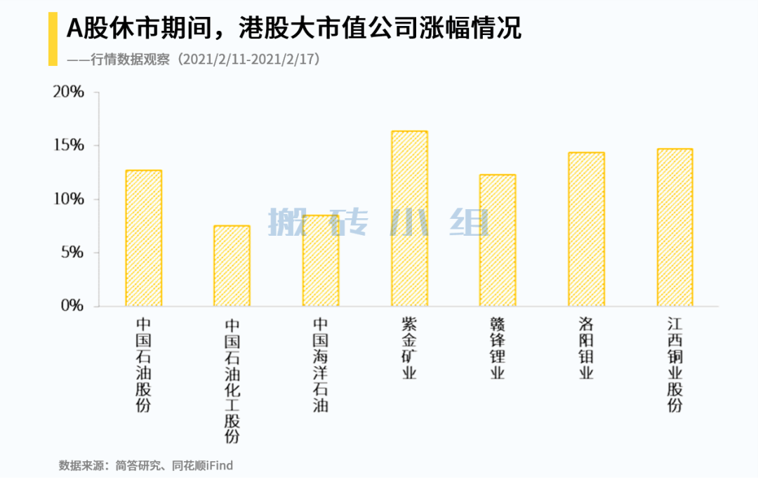 仔细看一下跟大A联系紧密的港股,在大市值公司里面,涨幅最突出的几个板块都围绕在资源品上,代表板块就是石油和有色金属。