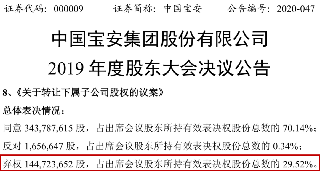 三股东宝安投资是国资背景,在公司一些决议投票上,与大股东不在一条绳上。比如在2019年的股东大会决议中,有一项转让子公司股权的议案,有1.45亿股投了弃权票,能到达这个数量级的股东,基本就是宝安投资了。