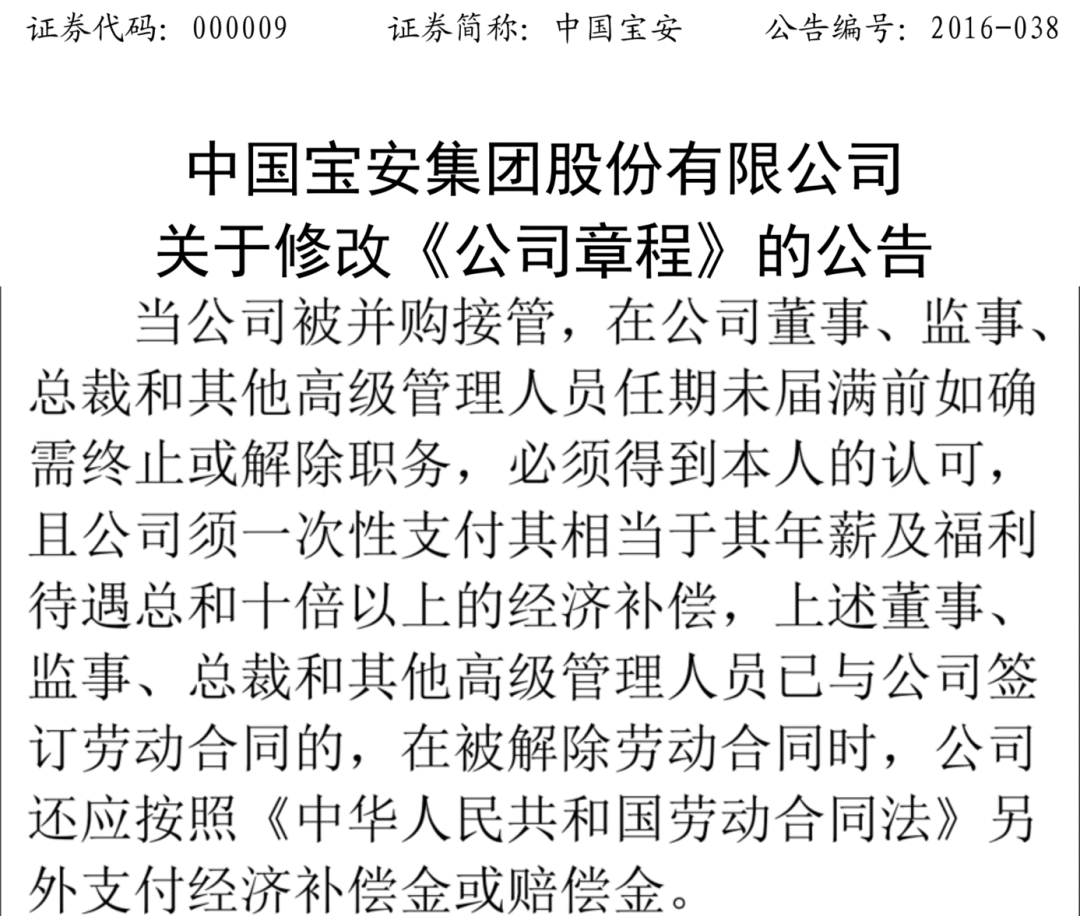 他早就考虑到了公司股权分散,可能被争夺控制权的情况,于是在2016年修改了公司章程,其中关键一条,简单说就是:并购方想要炒我们管理层鱿鱼,要支付十年薪资的赔偿。