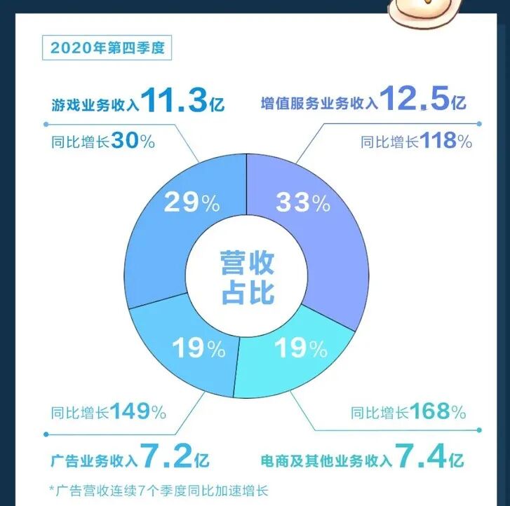 3)B站继续撕掉游戏公司的标签。游戏收入在2020Q4的占比已经下降到了30%,这个数字曾经一度占到80%以上。游戏已经不是B站最主要的收入来源,现在第一大业务是增值服务,也就是直播打赏抽成、会员收入这些。