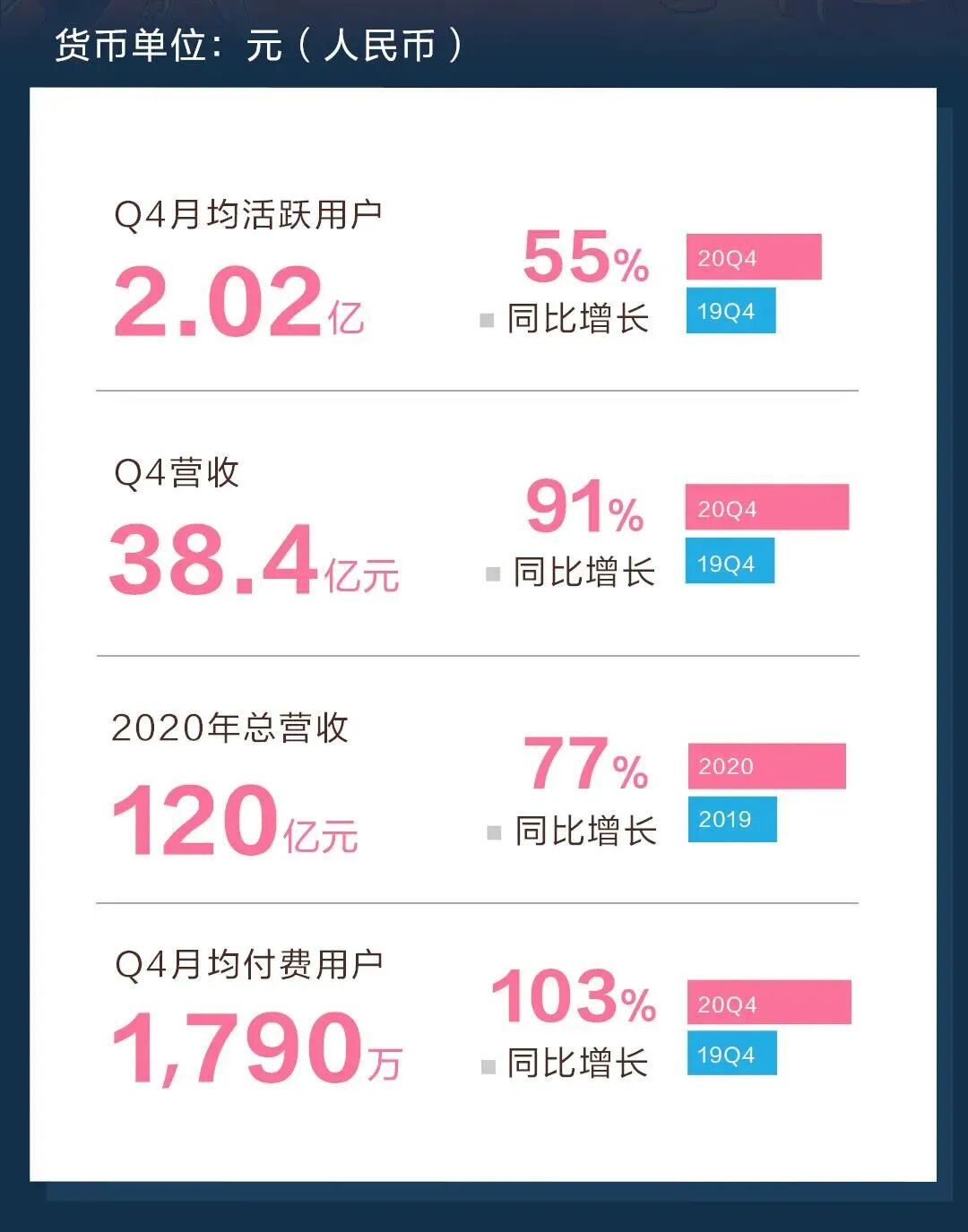 B站公布了四季度的财报,核心数据继续增长,收入38.4亿,同比+91%,创了单季度收入新高,月活用户2.02亿、日活用户5400万。增长虽然亮眼,不过亏损也很大,四季度净亏损是8.44亿元。