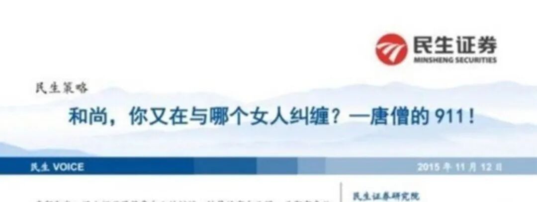 以前券商分析师也有用网络流行语做标题来吸引眼球,这种现象在上一波牛市里尤其突出,经历过的人应该都有印象。比如像民生政策就有一篇报告叫做《和尚,你又在与哪个女人纠缠——唐僧的911!》