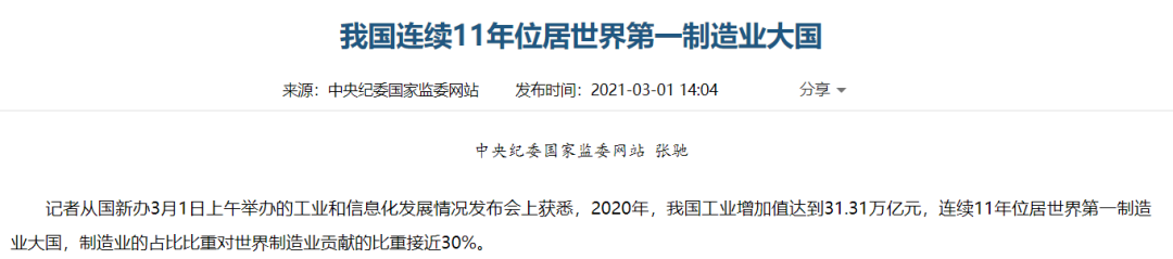一则消息燃爆各大头条,有关部门宣布:我国连续11年位居世界第一制造业大国。