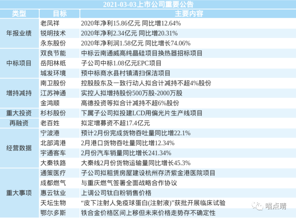 6、富时罗素昨日宣布了富时中国A50指数的年度审核变更事宜,此次变更新纳入了三一重工、紫金矿业、恒力石化;剔除民生银行、中国建筑、光大银行,该变更将于3月19日收盘后生效。