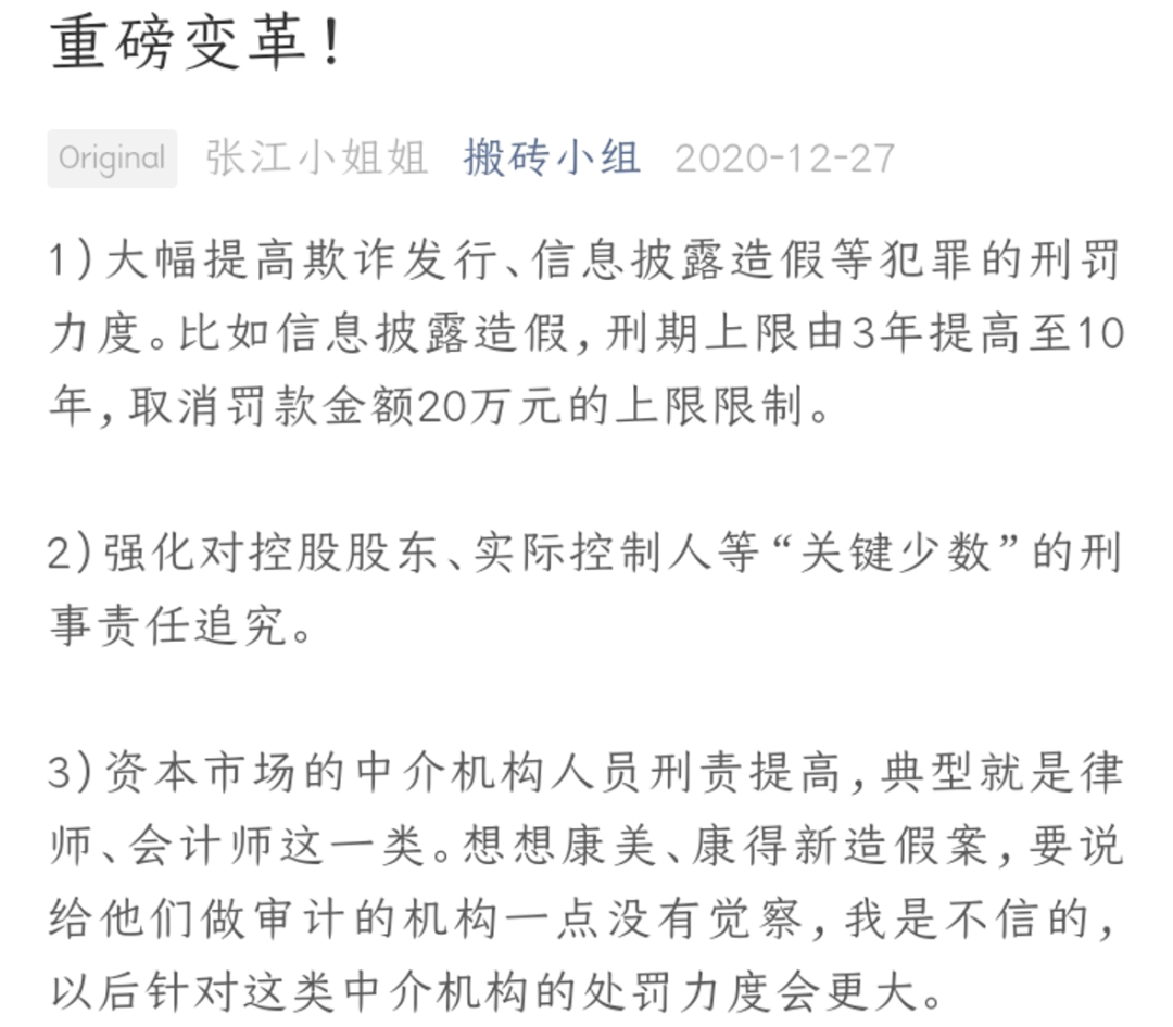 去年12月的时候,我们跟大家聊过资本市场的一个重要变革,刑法修正案审议通过,大幅提高了资本市场欺诈发行、信息披露造假等犯罪的刑罚力度,最关键的修改是提高刑期+取消罚款金额上限,实在是非常给力。