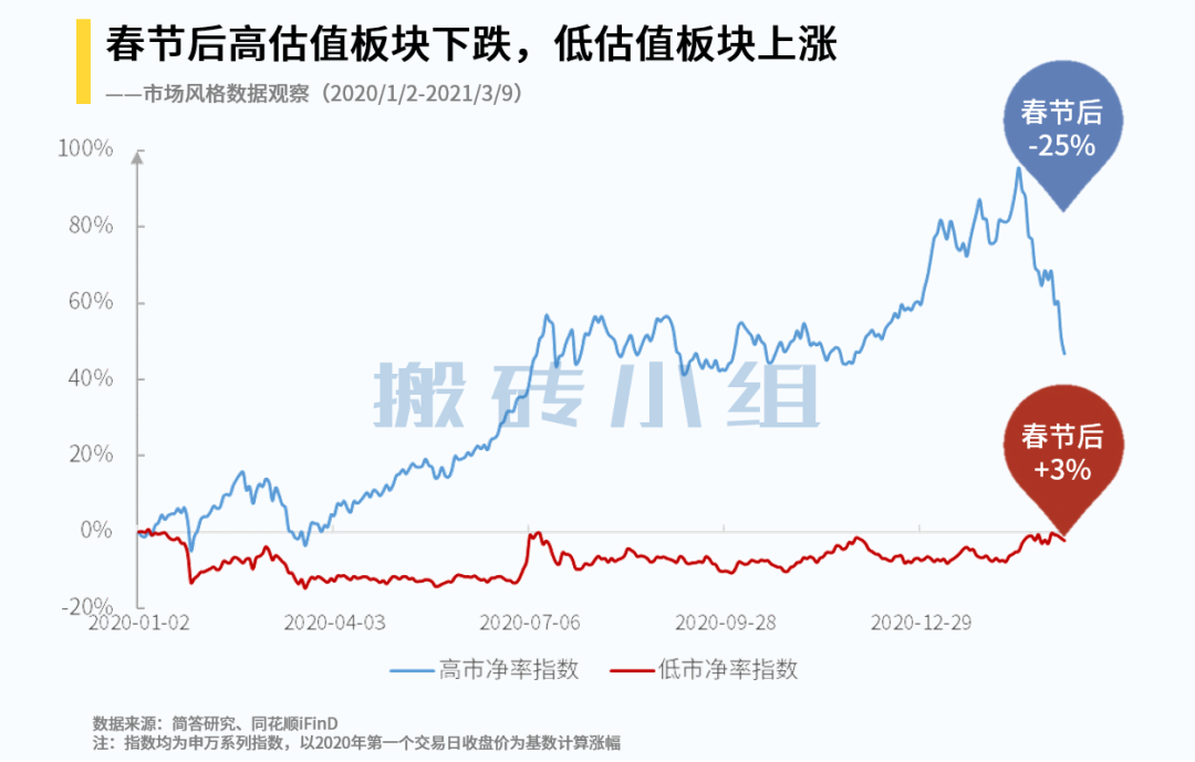 看看下面这张图,最近这段时间,跌的主要是高估值板块,从2月18日至今跌了25%,抹掉了去年7月中旬以来的涨幅,但低估值板块是上涨的,同期涨了3%。