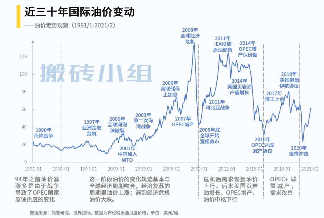 我们简单地将油价的变动分成几个大的区间,1994年之前油价暴涨多是由于战争导致了OPEC国家原油供应的变化。