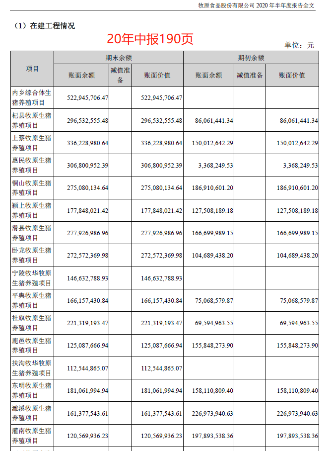 有人说牧原的固定资产巨大,这个我看了一下资产负债表的左侧,增长最快的资产项目是房屋和建筑,其实就是在多个地区设立项目子公司搭建养猪场,每个投资都不大,只是合起来金额数量级非常大。这也涉及到在建工程这个科目,光是20年中报的在建工程明细披露就占了5页,仔细看看明细就能看到公司在到处建猪场。