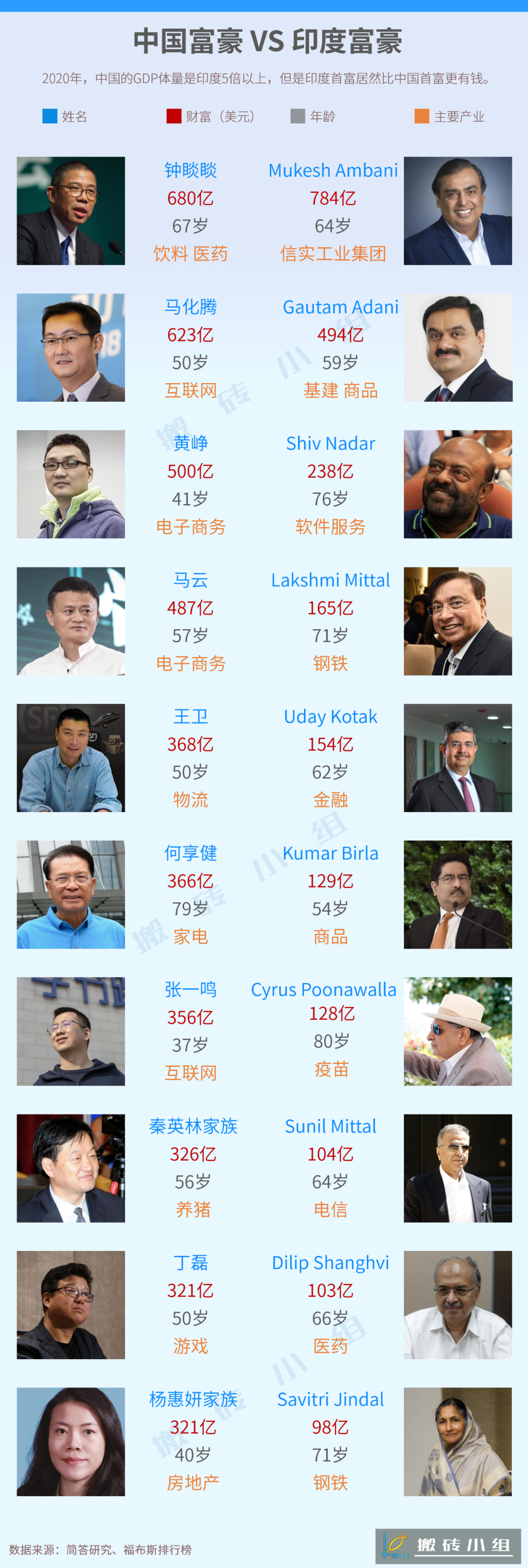 今天看到一组数据显示,印度首富比中国首富更有钱!