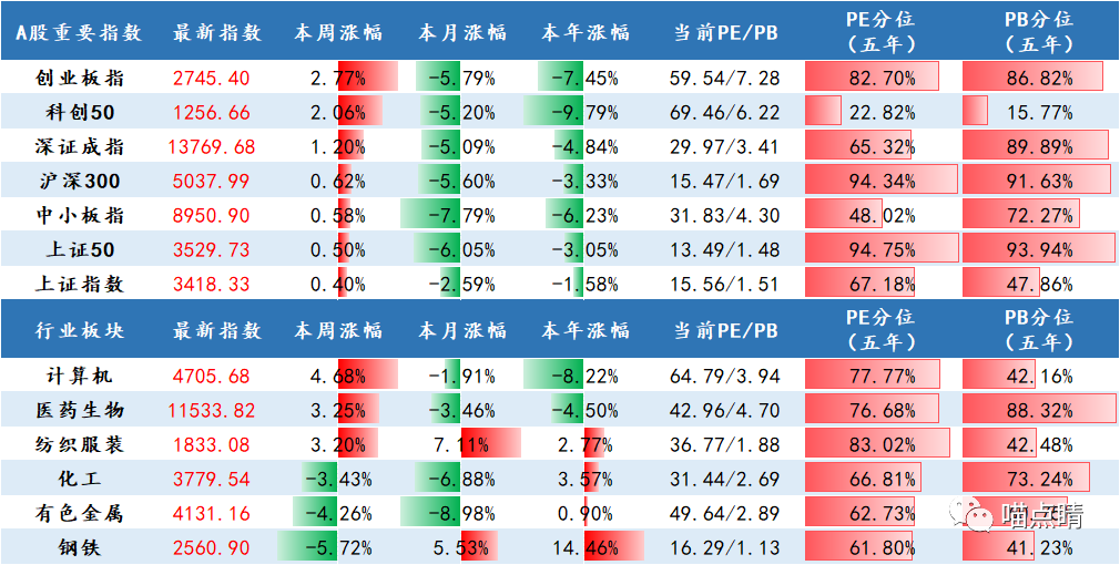 上周各大指数周线终于收了根阳线,难得的反弹时光如期而至,大伙多少也能回些血。在美股稳住的前提下,A股短期内波动应该可控,甚至还会继续弹一弹。但还是那句话,反弹后的选择才是最关键的,建议还是多看看性价比有优势的方向,业绩和估值的角力会是今年一年的主基调。