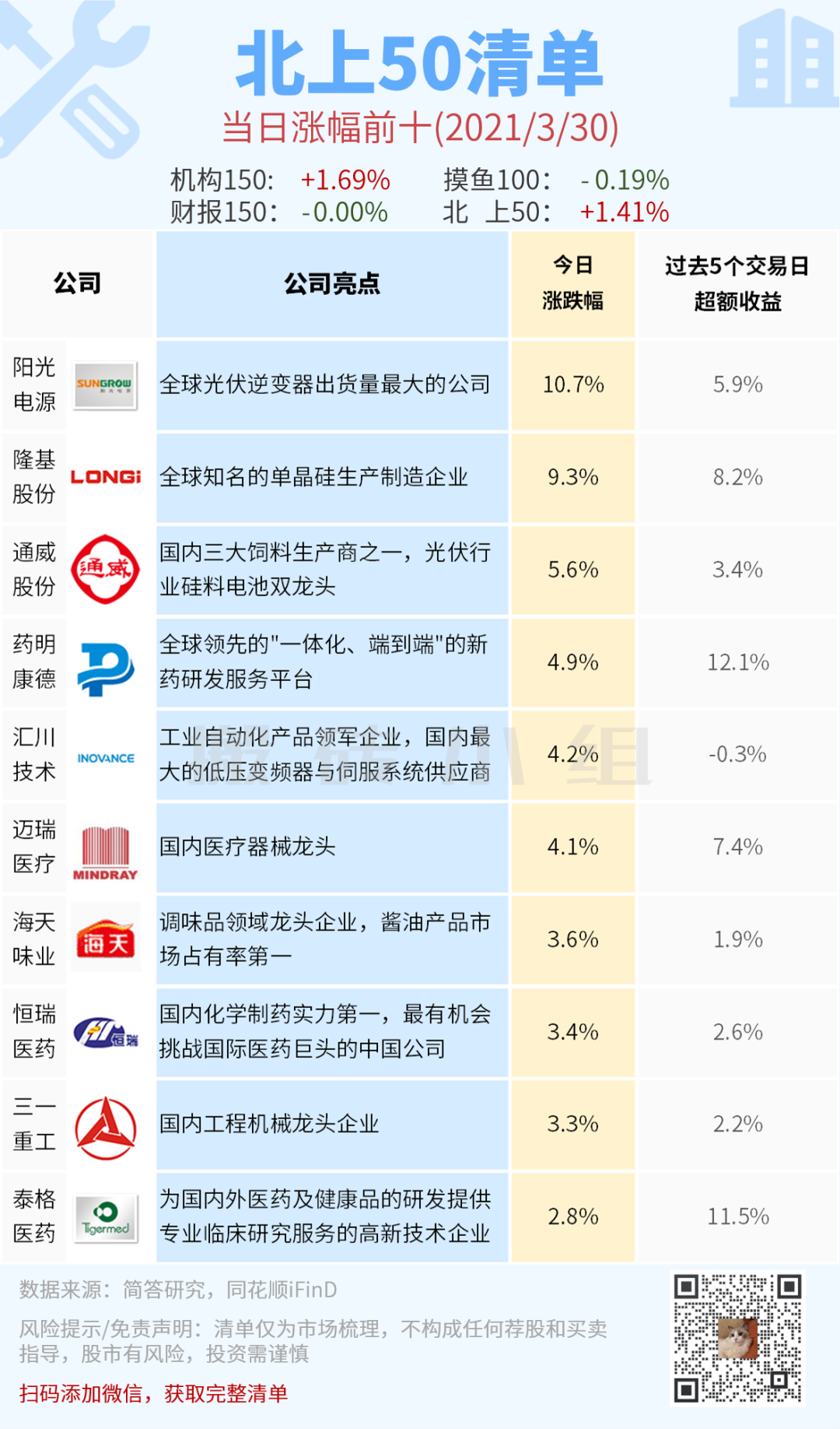 北上50榜单上今天比较猛的是光伏,核心资产轮动情况上面说过了,这里不多说,但对于光伏还是要提个醒,上半年的景气度可能会有低于预期的情况,临近一季报还是要小心一些。