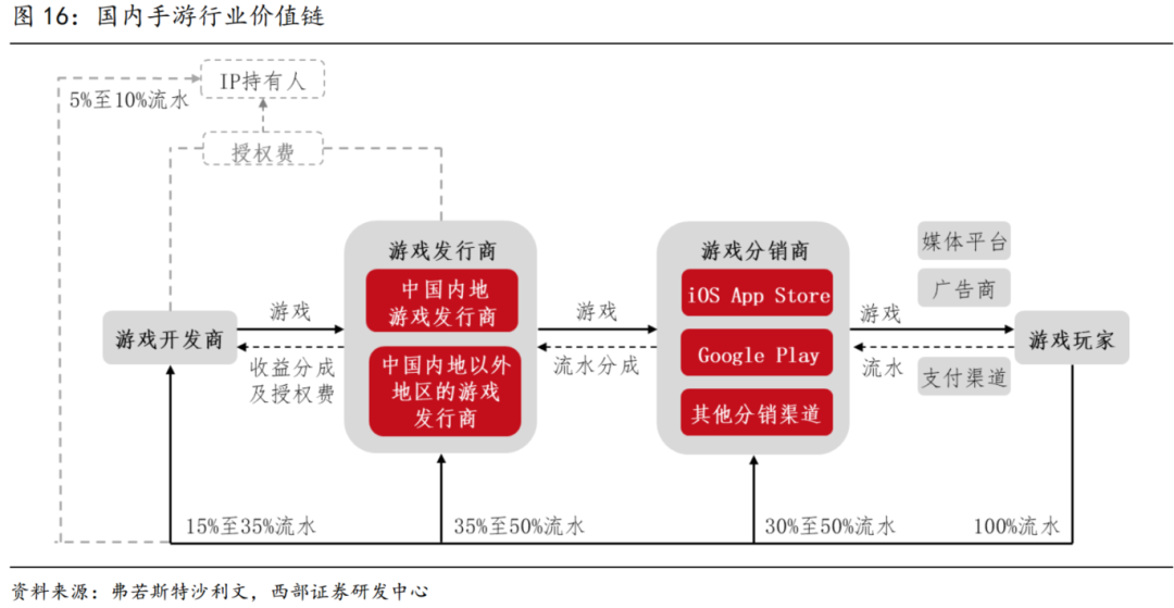 这里详细说一下,游戏业务是一个比较宽泛的说法,其实可以分为上游游戏开发商,中间的发行商和下游的渠道商。开发商开发游戏;渠道一般拥有巨大的用户流量,能够触达用户;而发行商就是连接开发商和渠道,进行各种游戏营销与运营等活动。