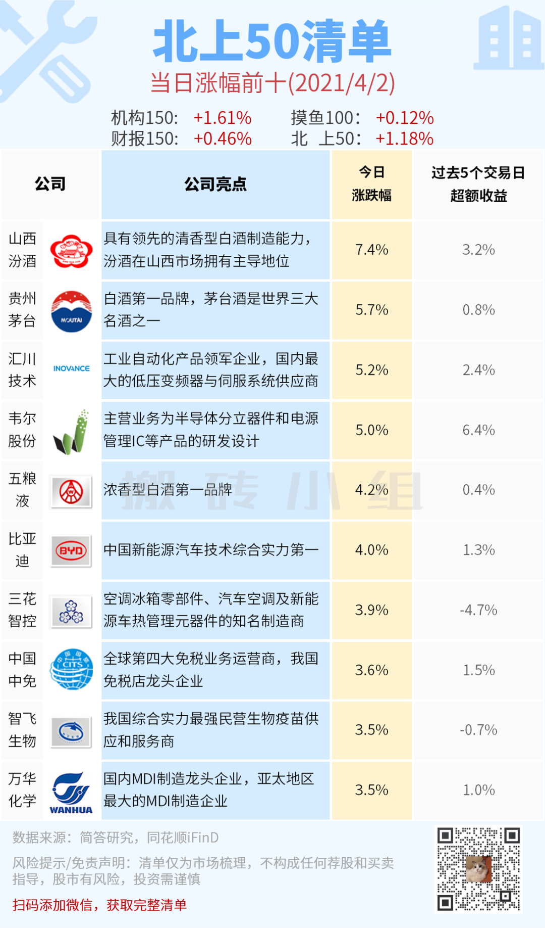 北上50榜单今天表现挺不错的,最亮眼的是榜单前二都是白酒,这个涨法很说明问题啊,果然白酒才是A股核心资金认可的核心资产。
