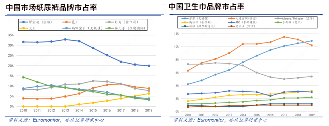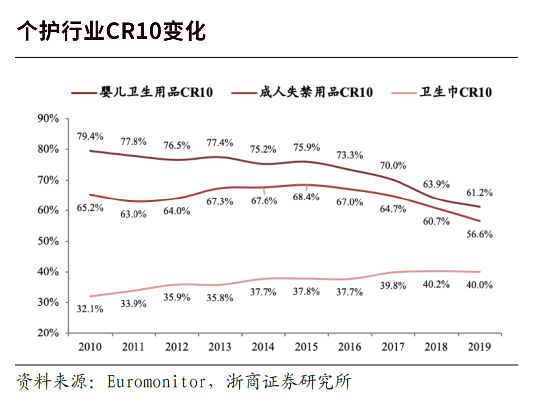婴儿纸尿裤和卫生巾都属于个人护理用品,他们的生产厂商有不少重合,我们发现一个数据很有意思:纸尿裤的市场集中度不断下降,CR10从2010年的80%下降到2019年的56%,同时卫生巾的市场集中度不断提升,CR10从2010年的32%提升到2019年的40%