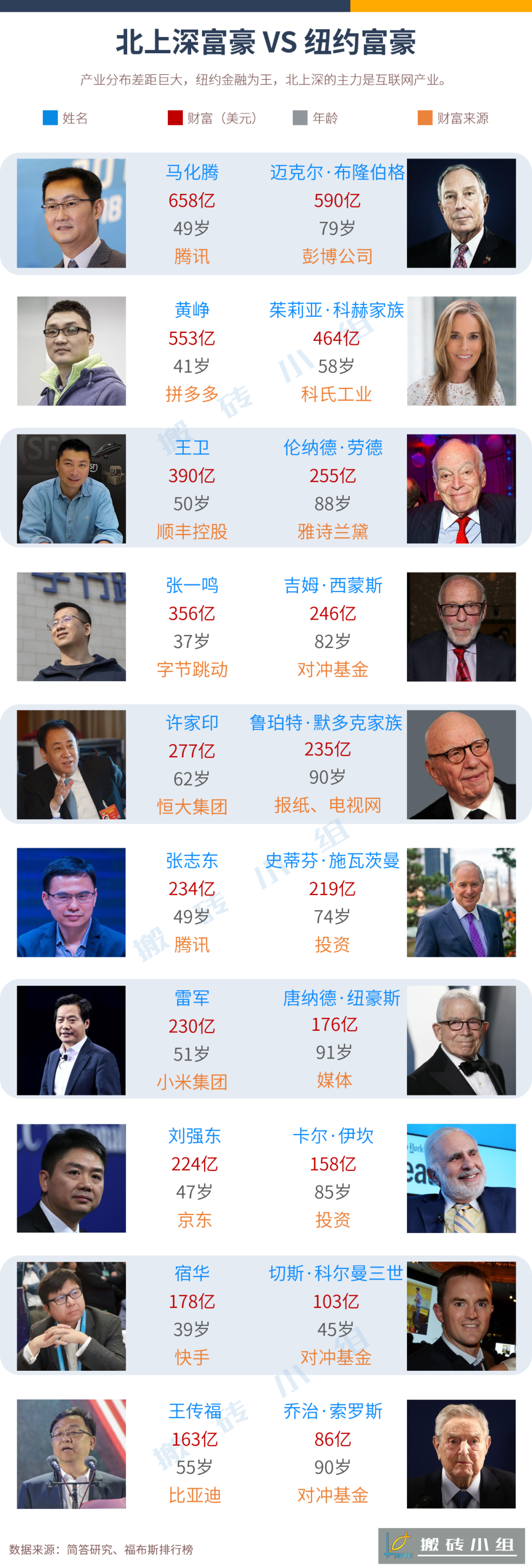 2)北上深富豪比纽约富豪年轻了一个档次,北上深富豪的平均年龄是48岁,纽约富豪是78岁,这就是这就是70后 VS 40后的感觉。