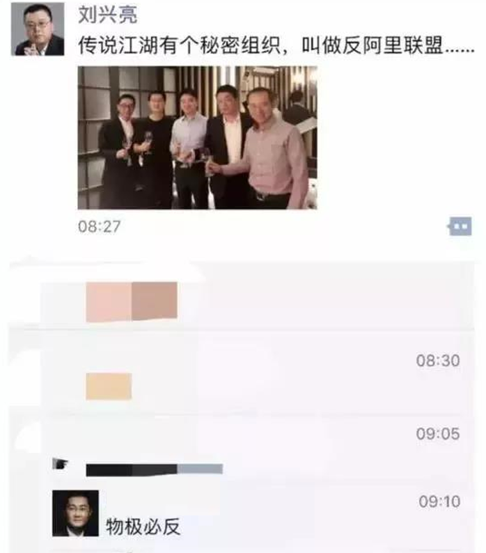 当时,资深互联网观察家刘兴亮在朋友圈发了一张小马哥、刘强东、沈亚等人的合影,并说:“传说江湖有个秘密组织,叫做反阿里联盟。”而小马哥回复了一句:“物极必反”。