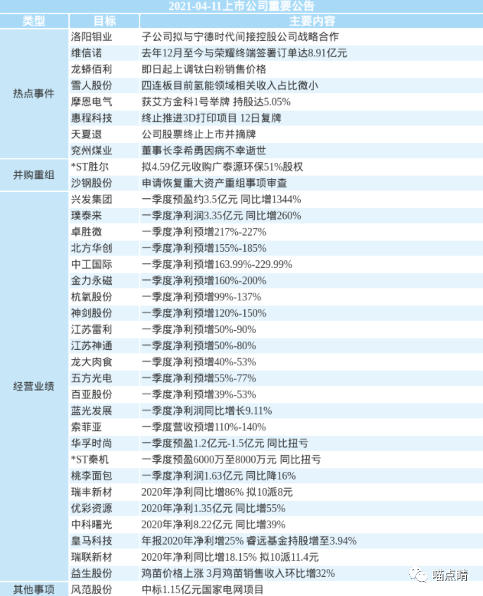 5、五矿稀土2021年第一季度预盈9594万元-1.06亿元,同比增长702.64%至786.3%,创一季度历史新高。部分稀土商品价格上涨,公司销售毛利率及整体盈利水平较去年同期大幅上升。