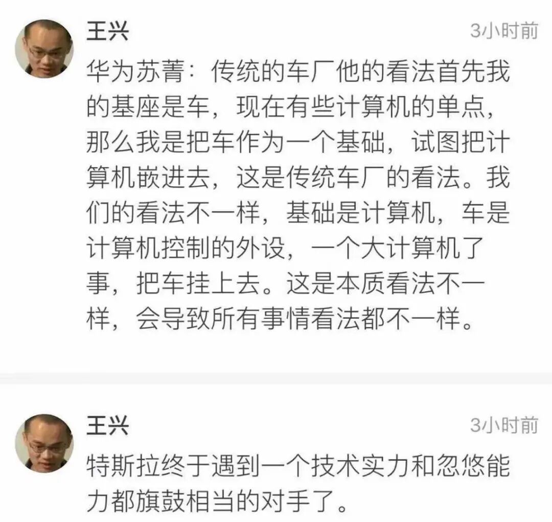 有些小伙伴可能还没感受到华为这一套东西对于产业链的影响有多大,美团王兴最近有个评论,上来直接就将华为与特斯拉做了个对标,而特斯拉毫无疑问是目前电动车领域最牛逼的公司。