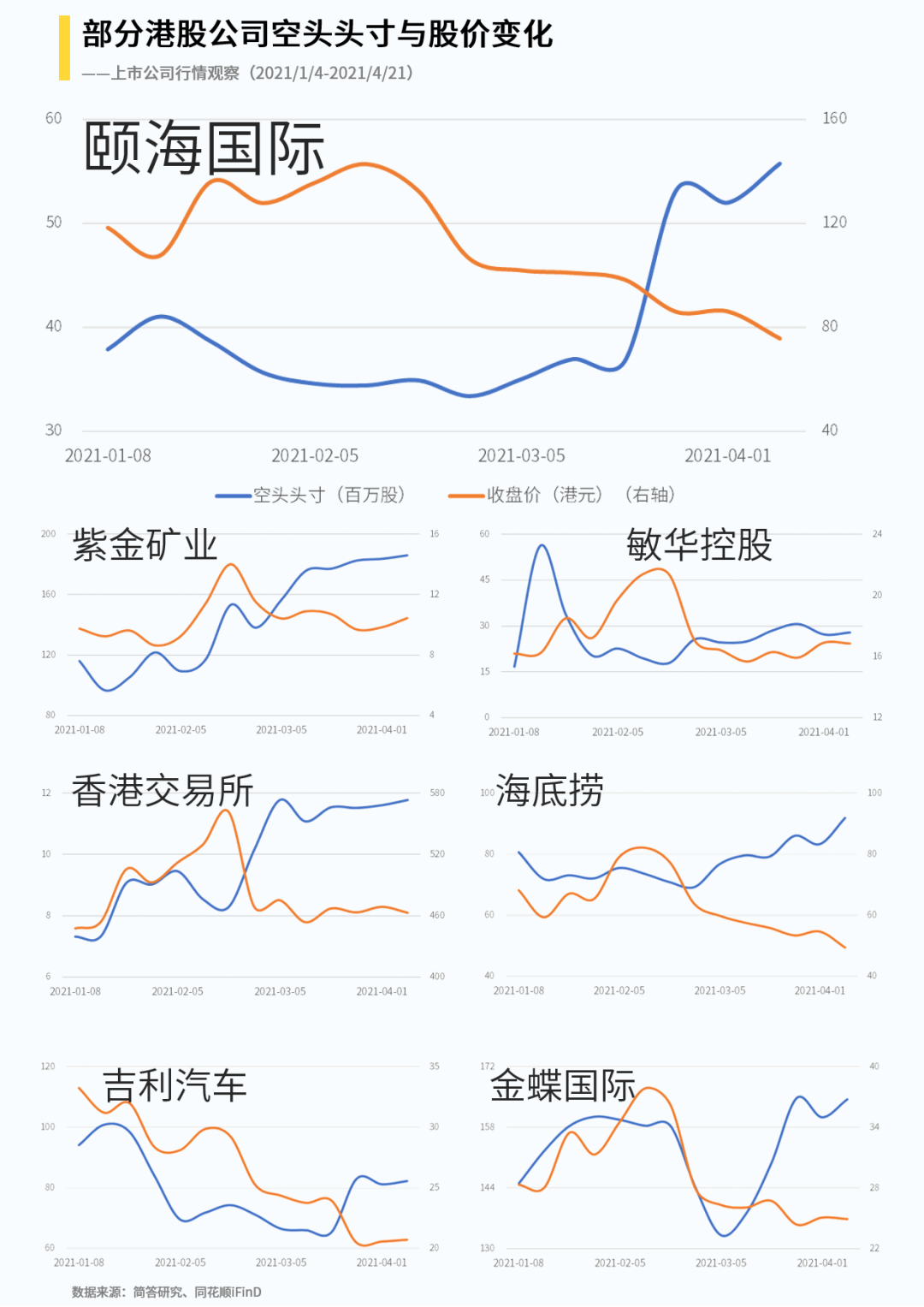 我们看看颐海国际的空头仓位情况,这波股价下跌的后半段,伴随着明显的空头仓位上升,老外玩到这里就是图穷匕见的感觉。我拉了南向资金持股市值前50的港股公司清单,其中不少大公司最近都有这样的走势: