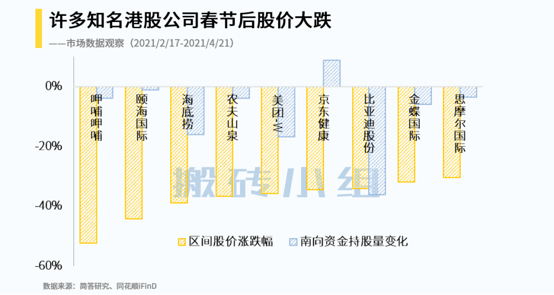 这些人被锤的这么惨,可能是有点犯了经验主义的错误,把A股的抱团逻辑硬往港股上套了。大家能看到,这些跌幅巨大的公司很多都跟消费板块有关系,在A股,基金经理们抱团,能把一些消费品公司的估值怼到百倍PE以上。