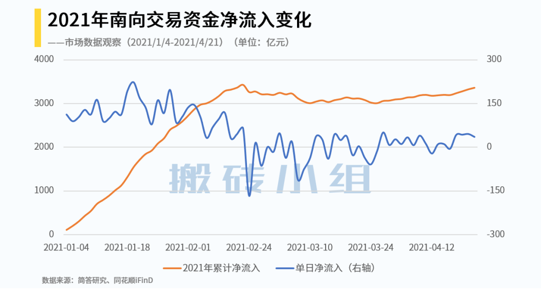 看看数据,能看到当时基金经理们对于跨过香江去有多热情,一月初到4月21日,南向资金往港股净流入了3365亿,最高单日净流入超过200亿,2月18日以后,即使恒生指数已经开始下跌,南向资金至今仍旧累计净流入192亿,往里面冲的人比往外面跑的人还多。