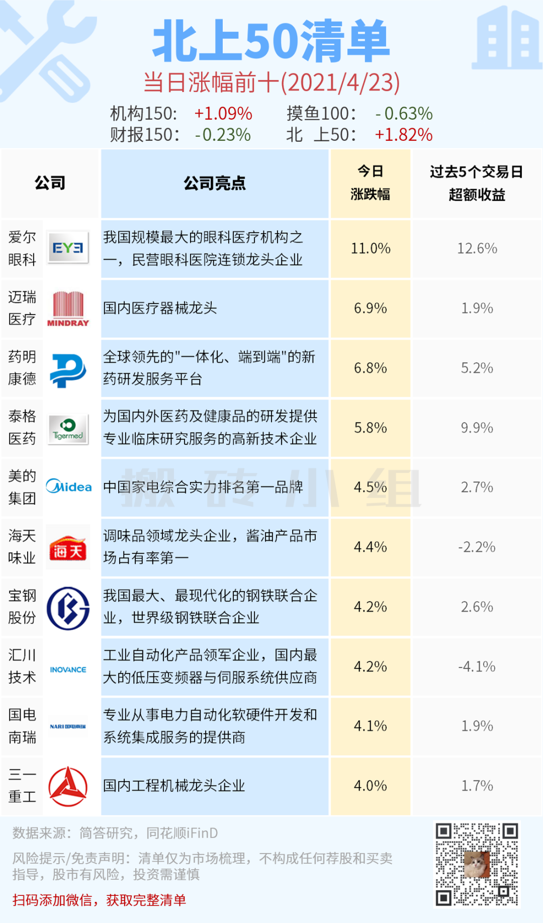 北上50榜单今天表现非常好,市场今天走得就是核心资产的反弹,涨幅前四全是医药,这块不多说了。