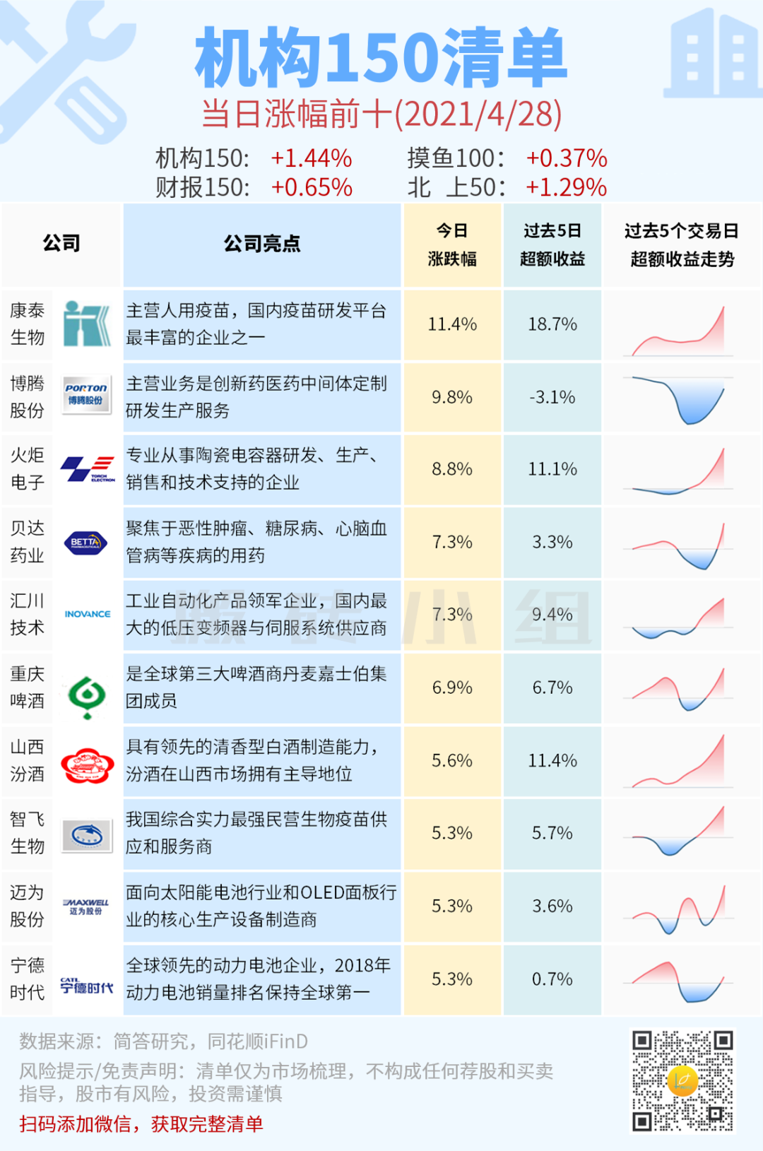 机构150今日上涨1.44%,医药表现持续优秀,康泰、博腾、贝达、智飞表现出色,主要还是疫情影响。