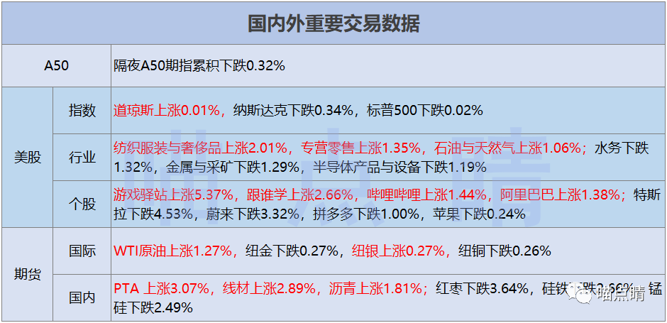 2、昨日上证上涨0.04%,深市上涨0.28%,创业板上涨0.56%,涨跌中位数-0.8%,涨跌停比52:51。两市成交额0.76万亿,北上净流入35.13亿。服装、化学领涨,旅游、机场领跌。